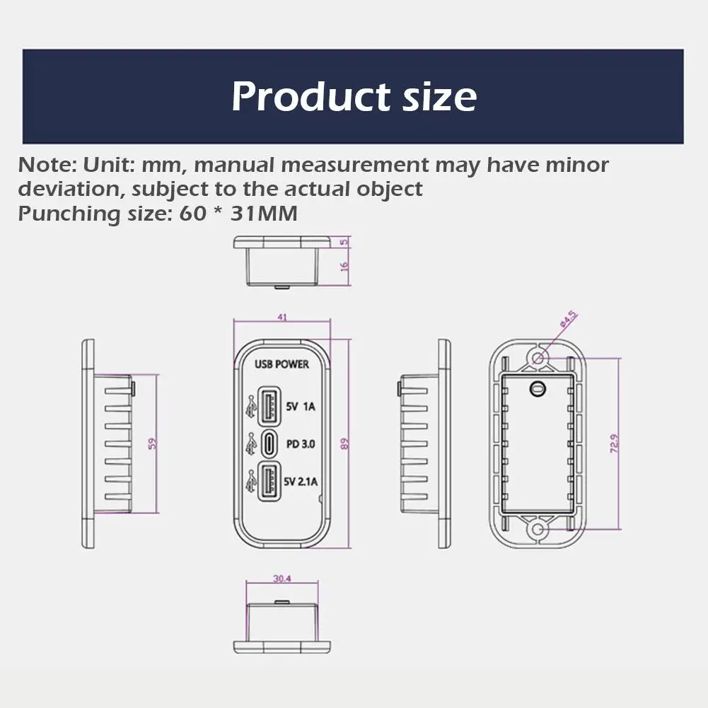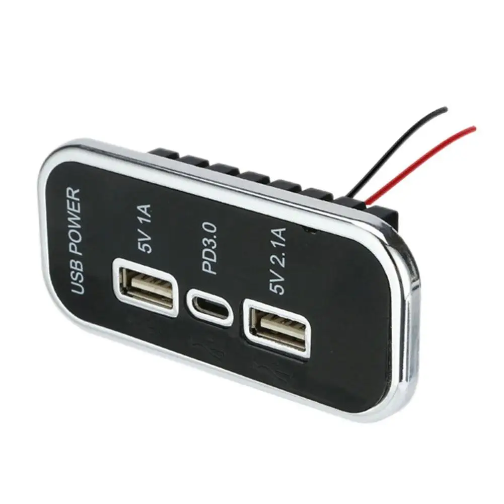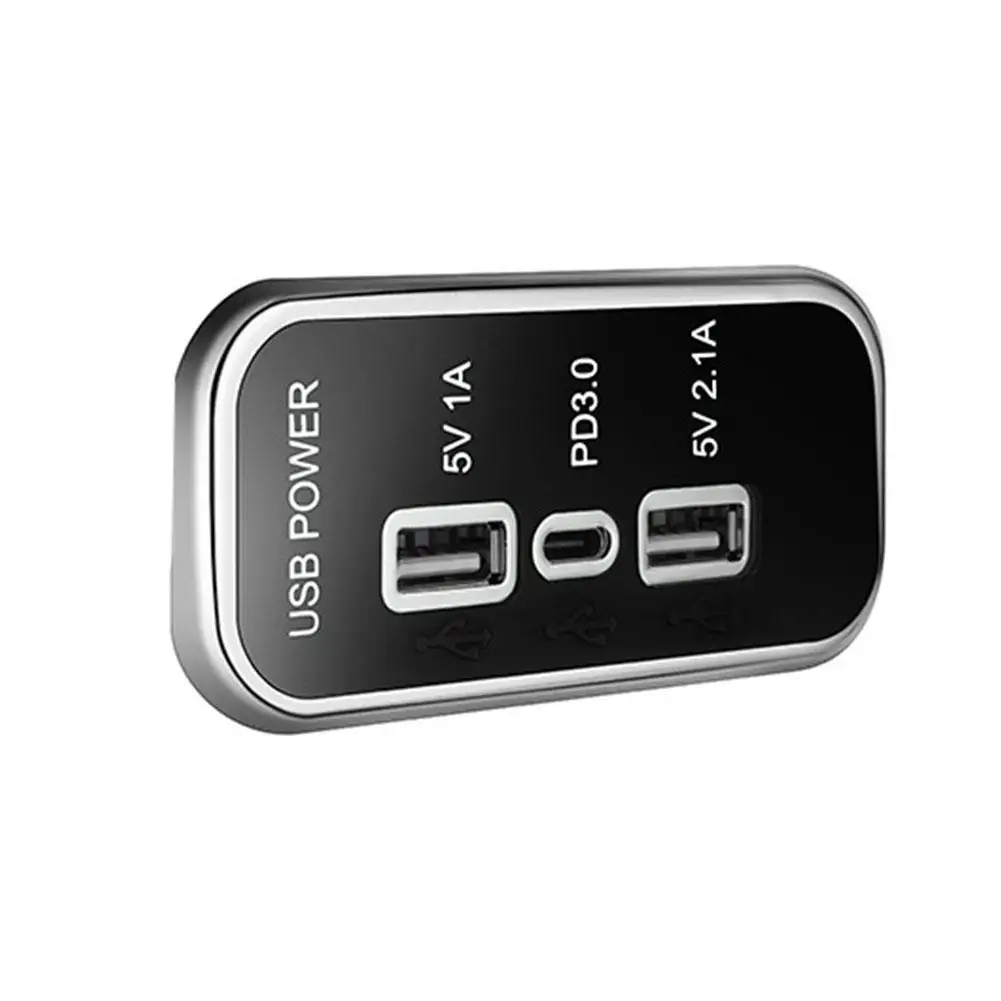 4.Simply installation It's surface mount installation. The device can be installed on a flat surface, with no need to cut a large hole, just a small hole to put the wire in, easy to be installed within 20 minutes. Universally suitable for most 12V/24V Vehicles, Cars, Motorcycles, Boats, RV. Input: 12V-24V,2.1A+1A+PD3.0