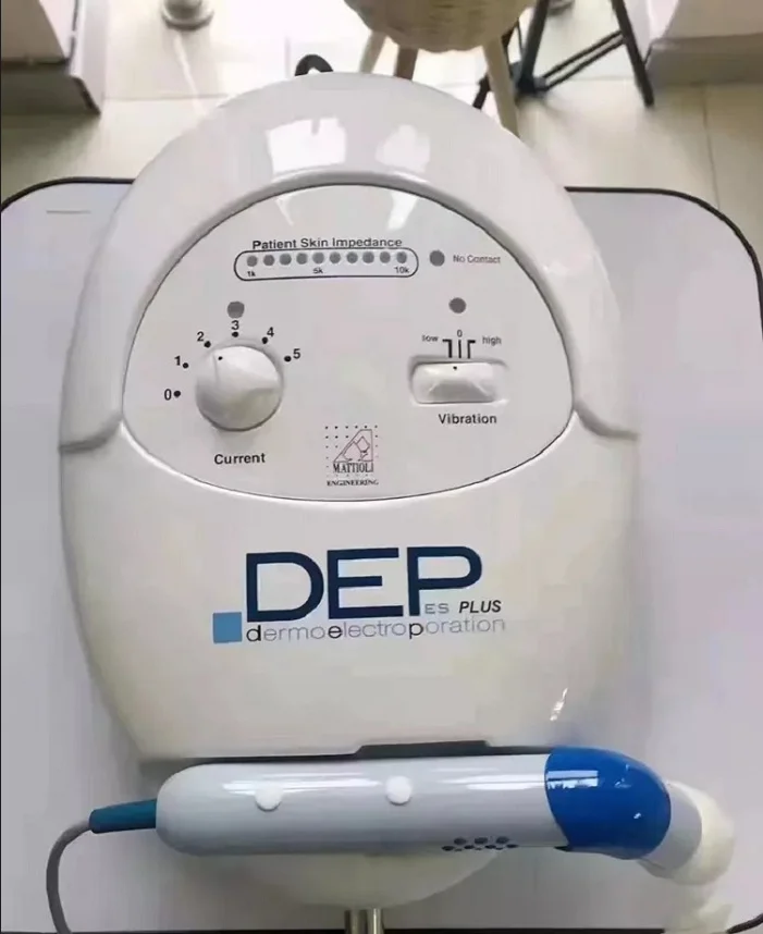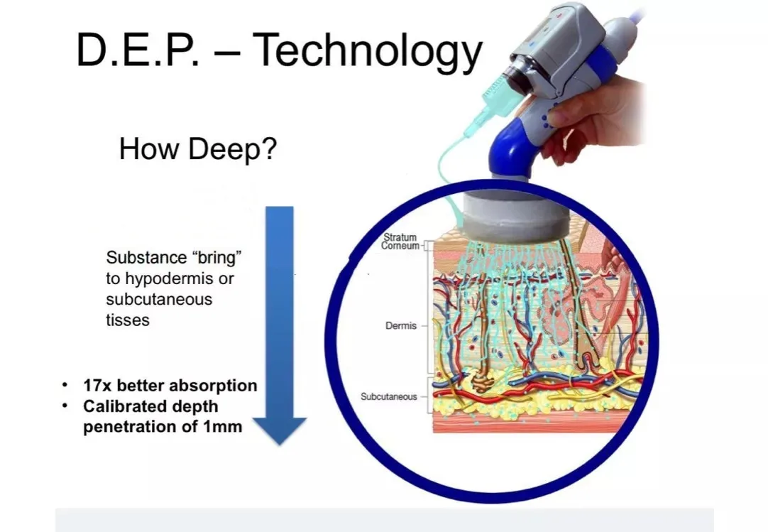 The system is currently used for No needles mesotherapy to deliver skin enhancement solutions, Hyaluronic acid, ammminoacids, vitamins, Collagen, elastine etc. The advantage of the DEP system is the built-in EMS (electro-magnetic-stimulation) that simultaneously stimulates facial muscle exercise to firm and lift facial muscles.