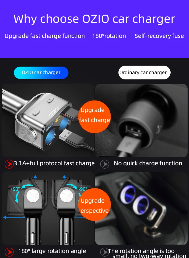 BUVAYE Car Charger One Drag Two Auto Lighters 180°arbitrary Adjustable Socket QC4.0 3.0 Dual USB Ports 90W Fast Charging