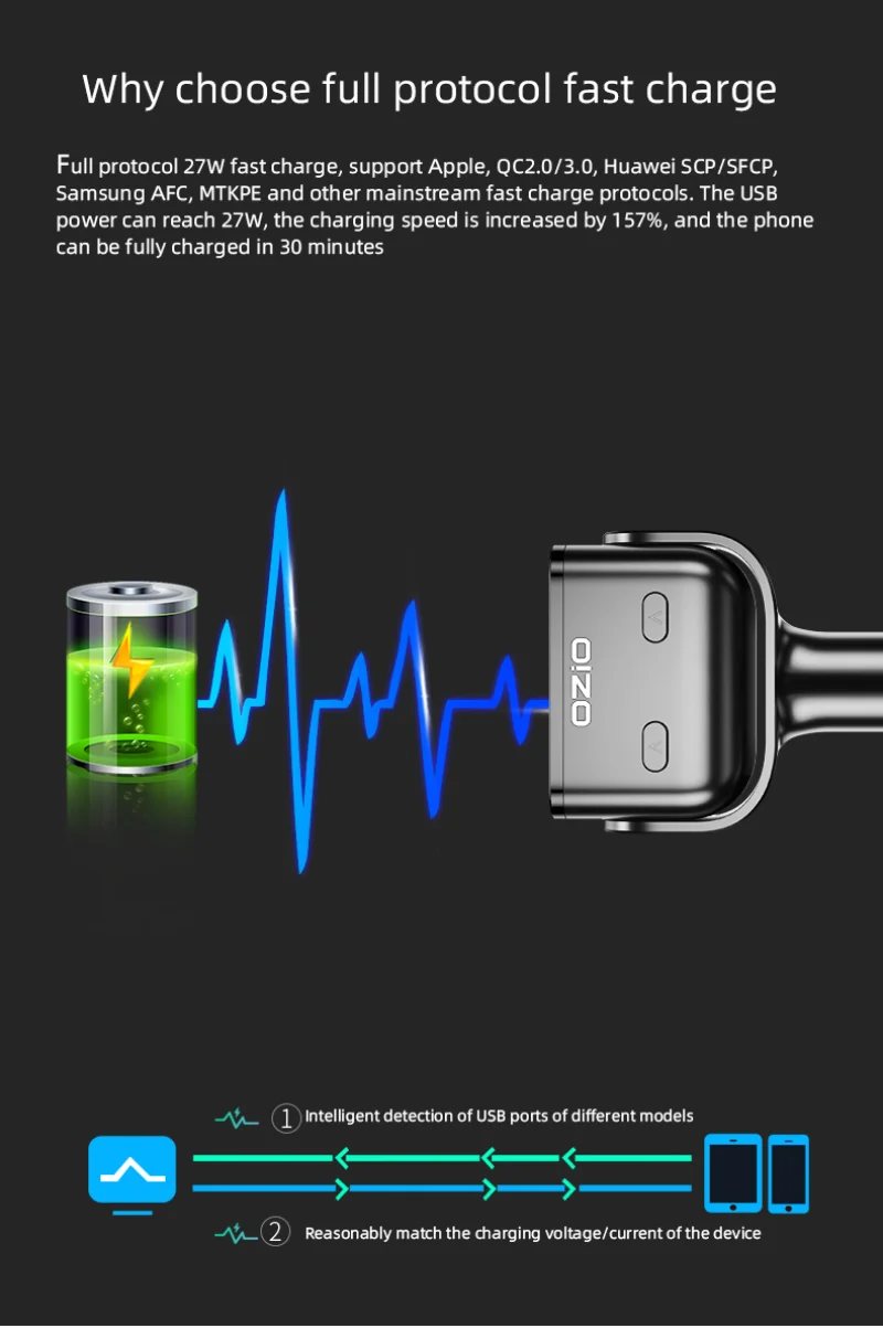 Full protocol 27W fast charge, support Apple, QC2.0/3.0, Huawei SCP, SFCP, Samsung AFC, MTKPE and other mainstream fast charge protocols. The USB power is up to 27W, the charging speed is increased by 157%, and the phone can be fully charged in 30 minutes 1: Intelligent detection of USB ports of different models 2: Reasonably match the charging voltage/current of the device