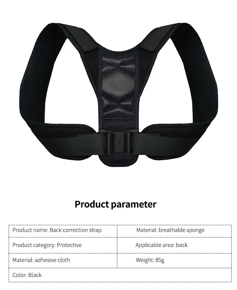 Product parametersProduct name: Back correction strapMaterial: breathable spongeProduct category: ProtectiveApplicable area: backMaterial: adhesive clothWeight: 85gColor: Black NoticePlease follow the steps below to complete the dressing