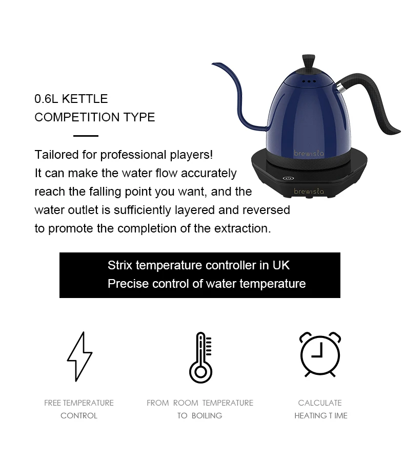 BREWISTA ARTISAN 600ML GOOSENECK VARIABLE TEMP KETTLE FEATURES Set An Exact Temperature –An LCD display allows you to select the exact temperature you want to brew with,and the kettle takes it there for you. Common Temperature Presets – Includes preset temperatures for coffee and all tea types.