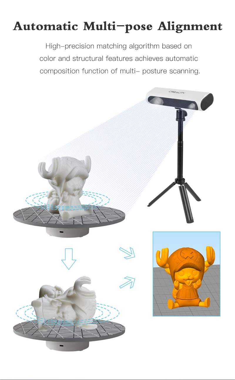 Easy Operation and Quick Installation:CR-Scan 01 3D modeling scanner adopts intelligent wide-range alignment algorithm to ensure automatic matching, there is no need to manually mesh alignments, calibrate or use marker points. For Upgraded combo, tripod and turntable can simplify the scanning process. One Click fully automatic completion of the scan, support multiple poses automatically aligned, fully automatic to get more complete model.