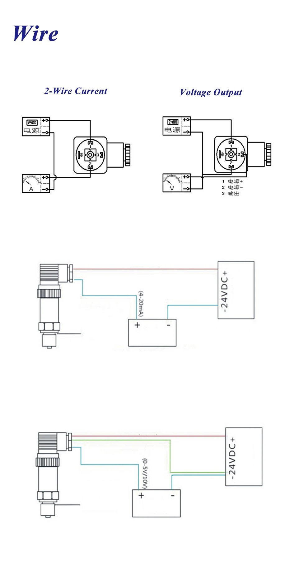 3.The pressure sensor can output a variety of signals, and select the appropriate signal access according to the customer's PLC/DCS. Conventionally, it can output 4-20mA 0-10V RS485 signal of 2-wire / 3-wire / 4-wire.