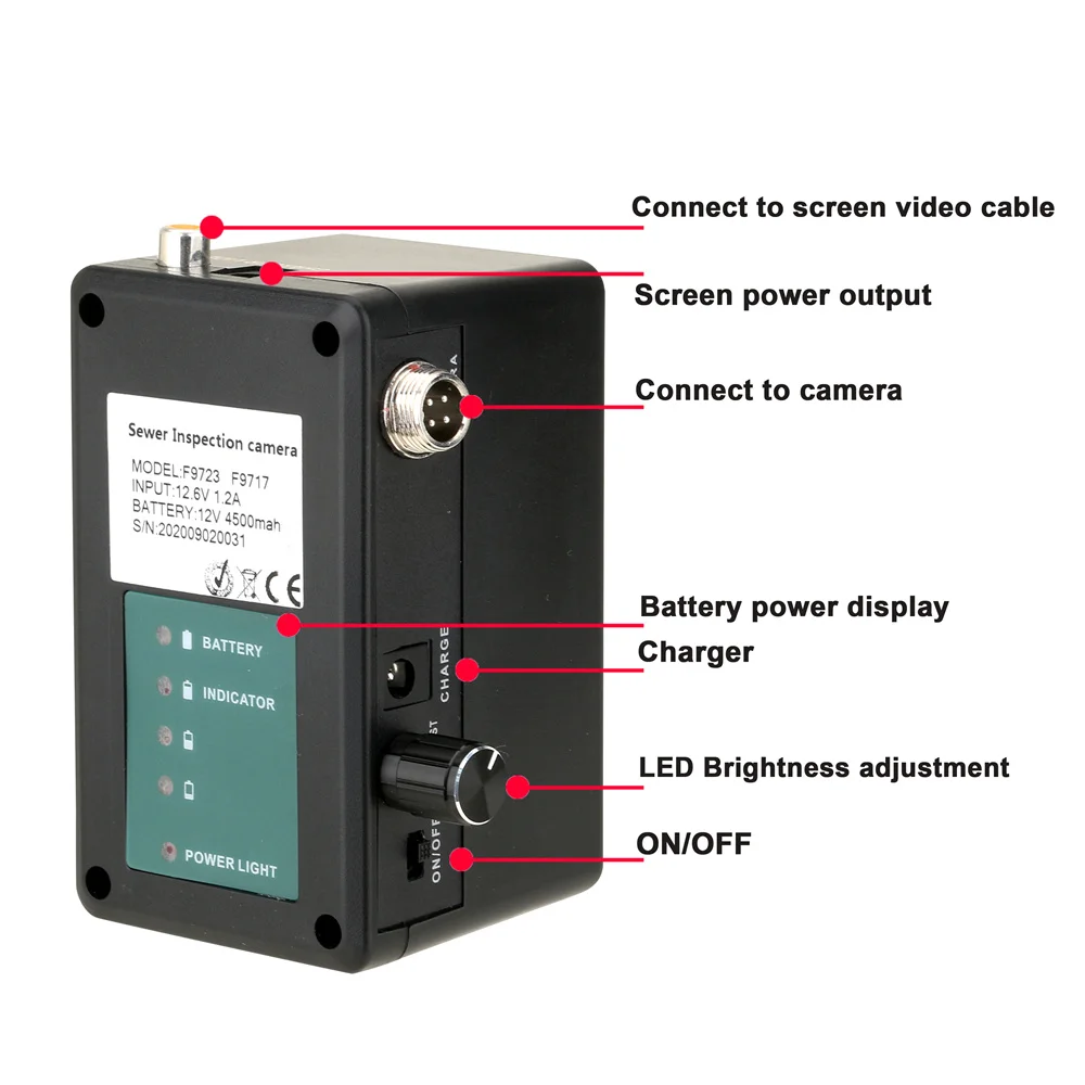Pipe Wall Sewer Inspection Snake Camera Kit with heavy duty padded aluminum case stores all contents, convenient to carry around. 12V 4500mAh Li-battery included supports approximate 8 hours of continuous use.