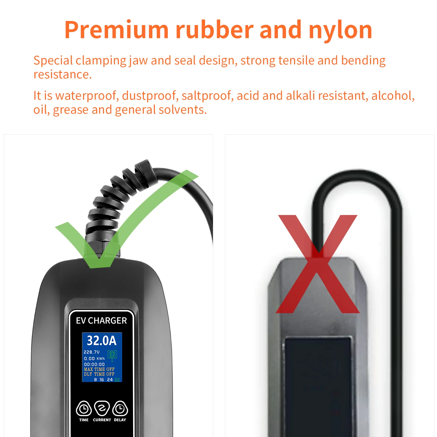 In order to provide first-class quality, we use a new design and use high-strength alloys. Experimental test, EV charger can bear the weight of the car.
