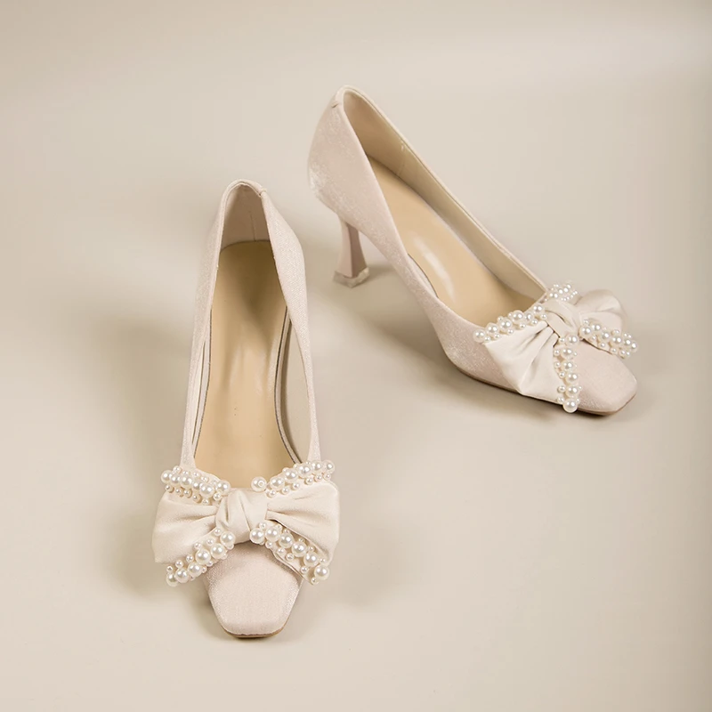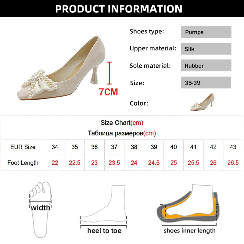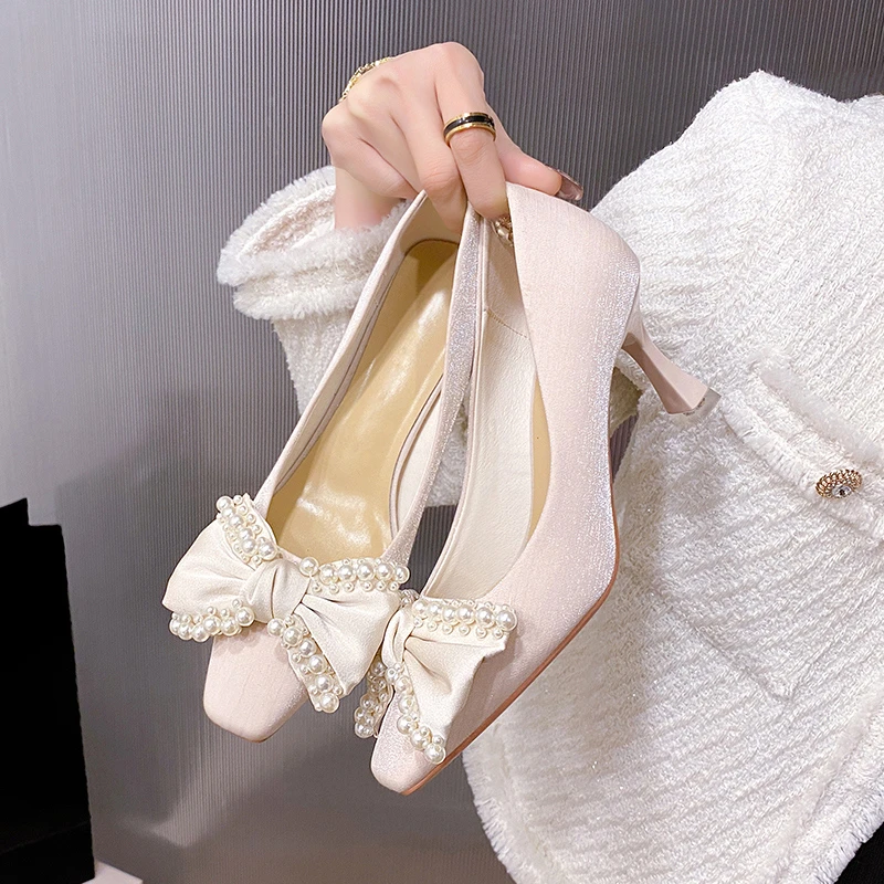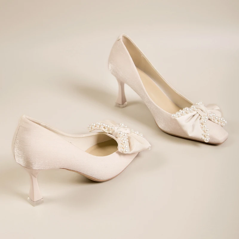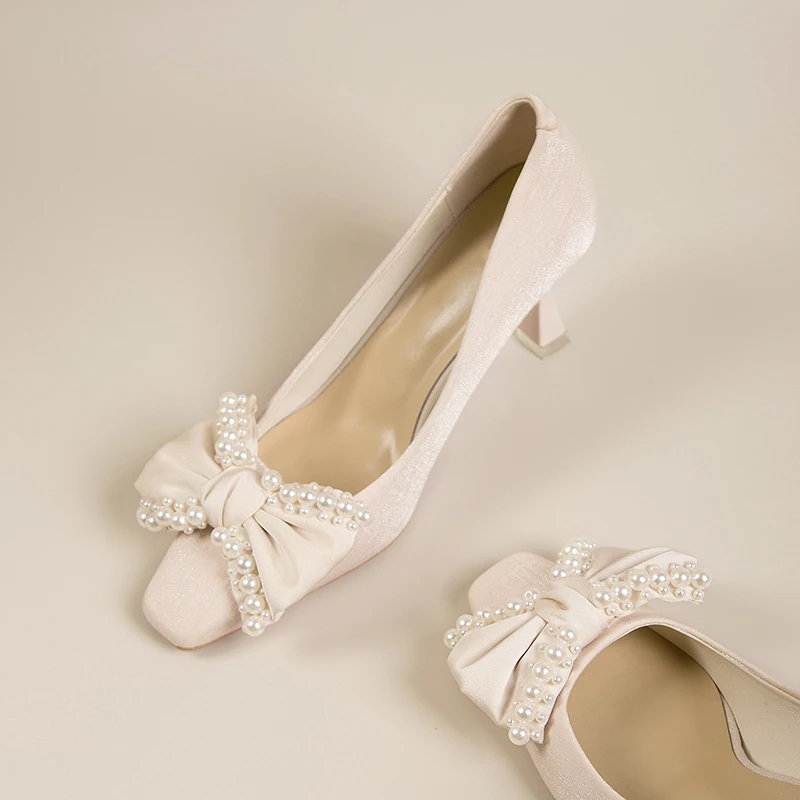 Elegant Pearl Bowkont High Heel Pumps Women Summer Slip-On Shallow Party Shoes Woman Silk Square Toe Stiletto Heels Shoes Ladies