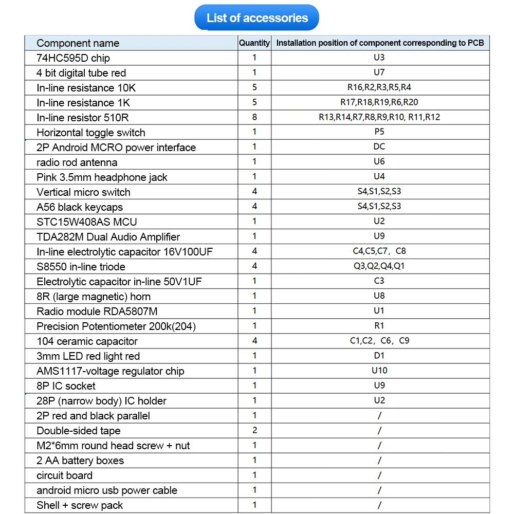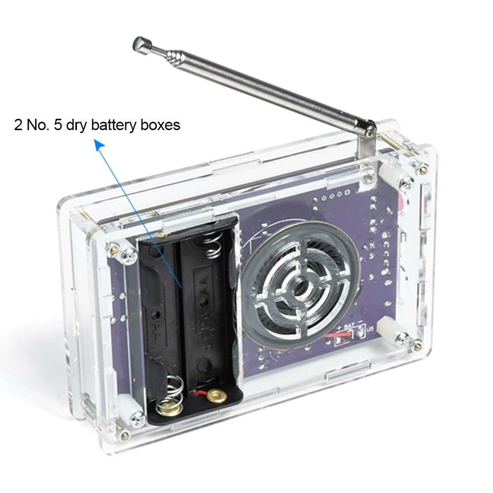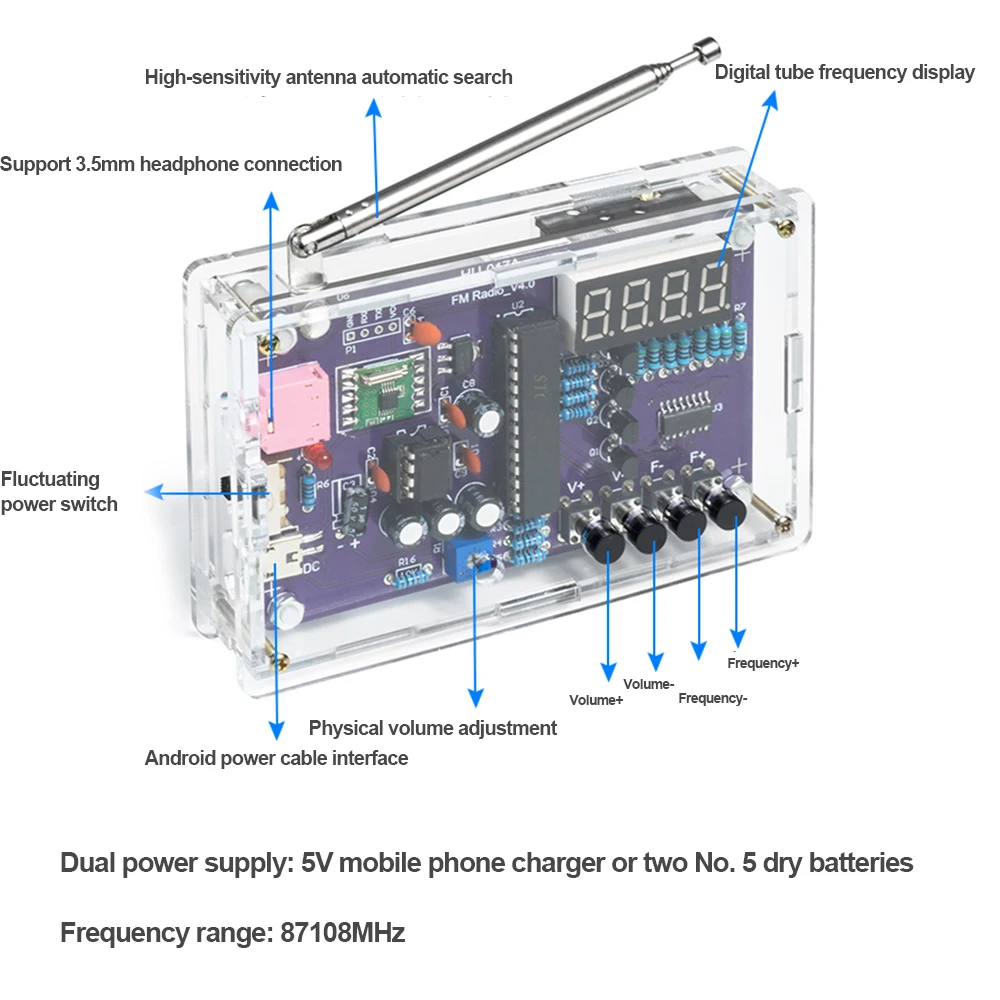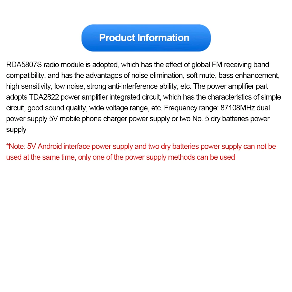The use of RDA5807S radio module, with global FM reception band compatible effect, with noise elimination, soft mute, bass enhancement, high sensitivity, low noise, strong anti-interference ability and other advantages