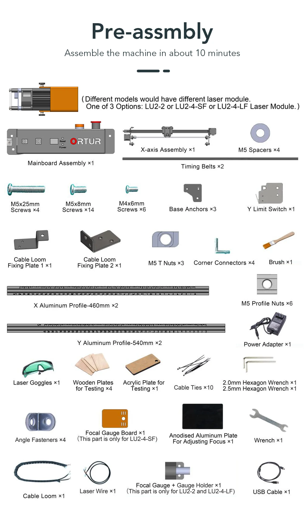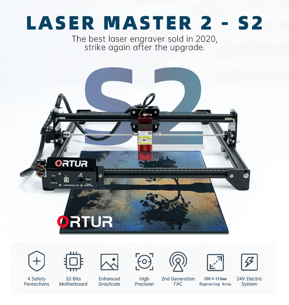 ● Ortur Laser Master 2 PRO S2 the safest diode laser engraving machine of Ortur seriesMax. engraving speed 10,000mm/minLU2-2 Luninous power 1-1.6 W, electrical power 7W.LU2-4 SF/LF Luninous power 5-5.5W, electrical power 20W.