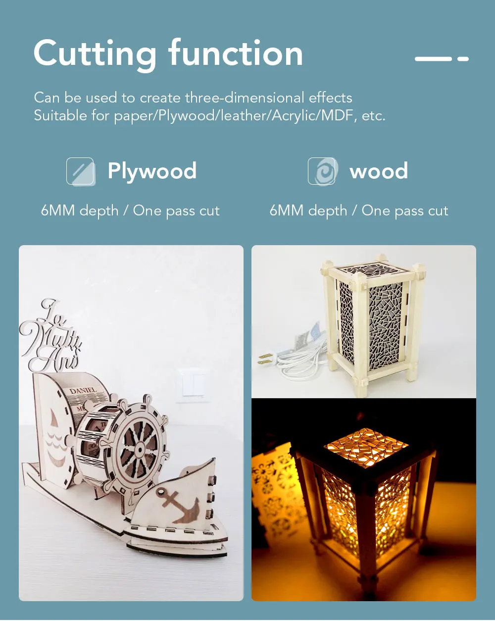 Both SF and LF can do engraving and cutting! The focus of the SF laser is smaller, the image is finer, and it is more suitable for engraving specially for hard materials like stainless steel.LF has a longer depth of field with bigger power density. and it is more suitable for cutting.The max. thickness is 12mm plywood (equipped with LF nozzle, the cutting surface is smooth and there will be no black edges).