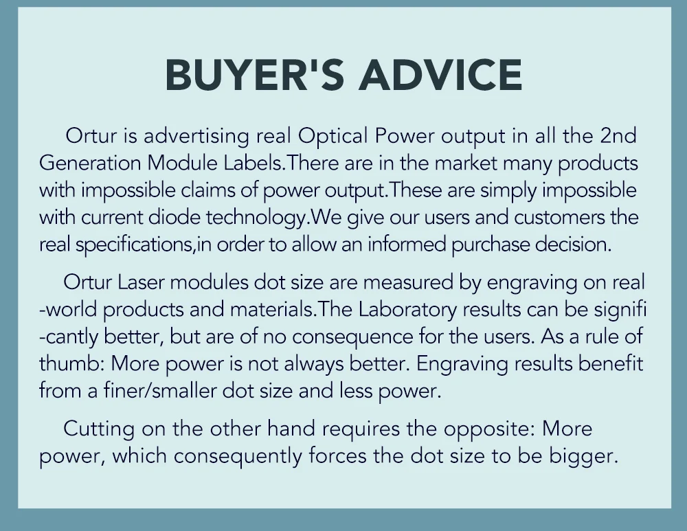 Latest Laser Beam Compressed Focal Spot Technology: Ortur Laser Engraving Machine adopt the latest 5.5W higly compressed focal spot laser modulediode, it has an ultra-fine 0.06mm sharp laser focus, with super cutting penetration and precision, can cut up to 12mm thick wood, 10mm acrylic, carve ceramics and stainless steel.