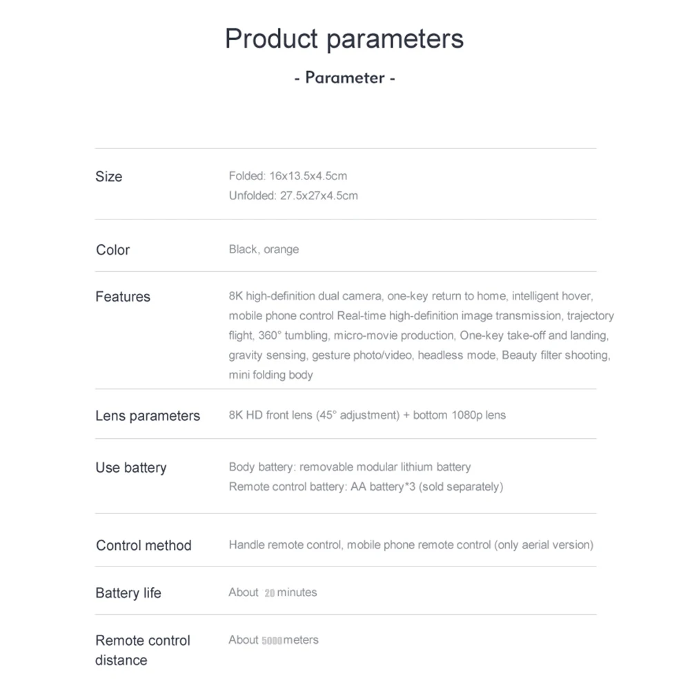 ***Up / Down, Forward / Backward, Left / Right, Lateral Flight, Level 3 Flight Speed, LED Light, Follow Me, Flight Around, Waypoint Flight, Altitude Hold Mode, Headless Mode , One-button return, one-button take-off / landing, WiFi FPV, camera / video