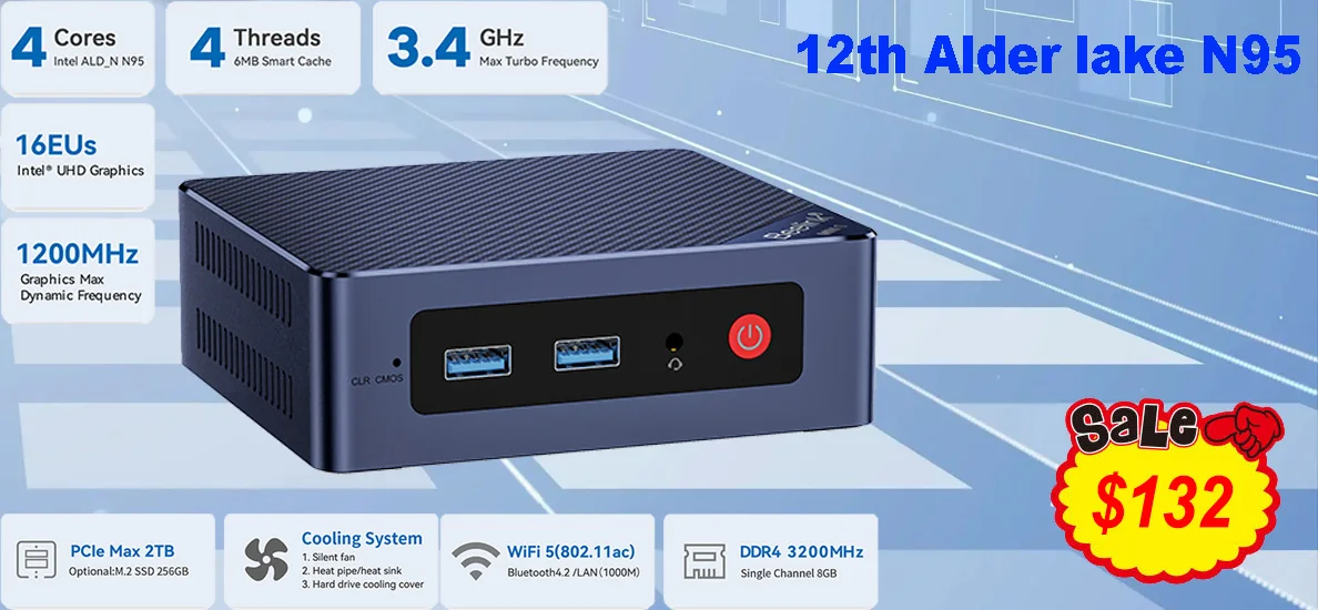 CPU: Intel Alder Lake N95, 4 Core 4 threads, Up to 3.4GHz, 15W TDP