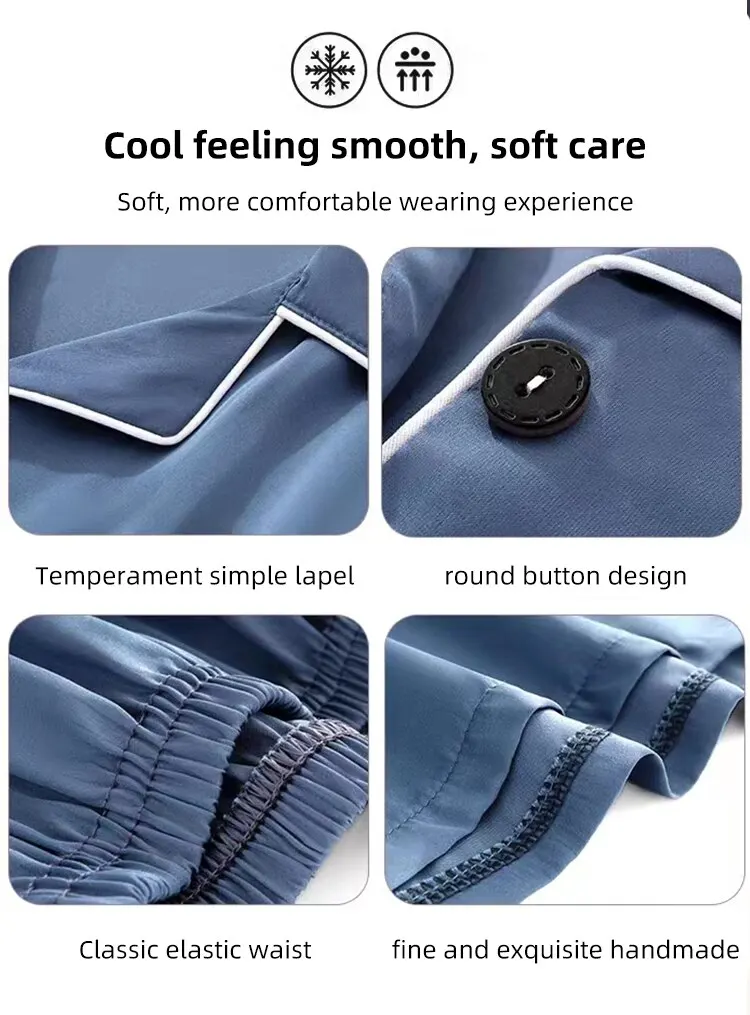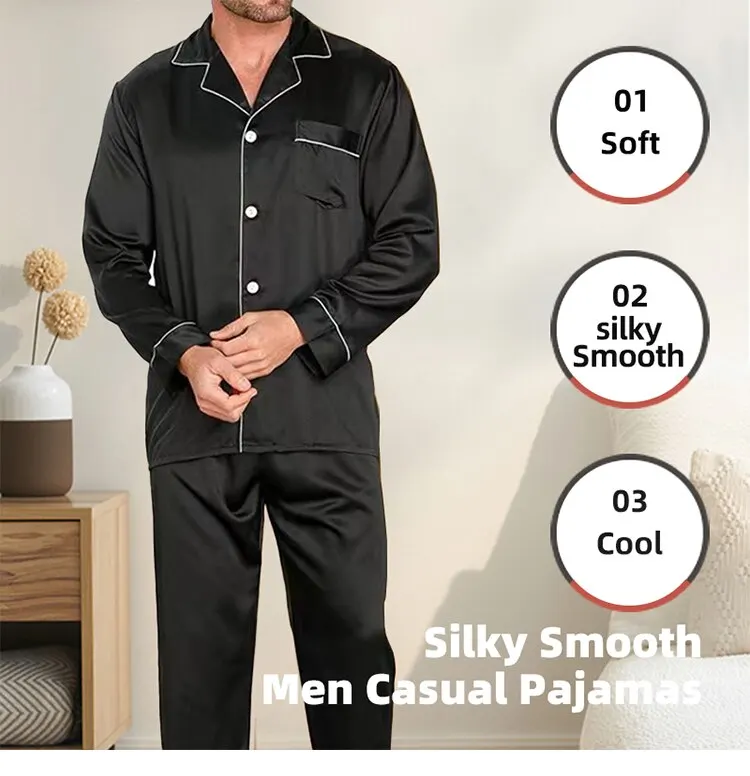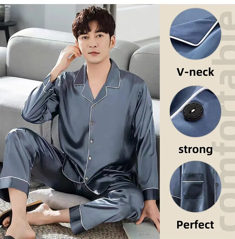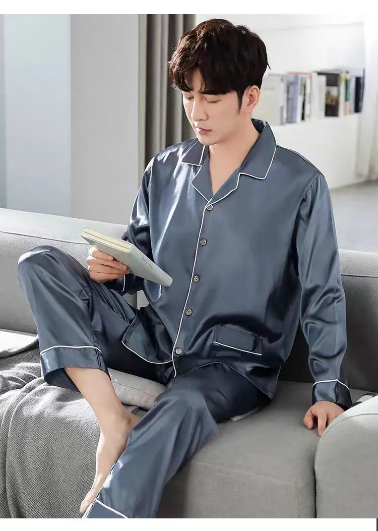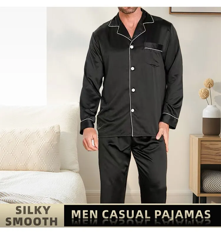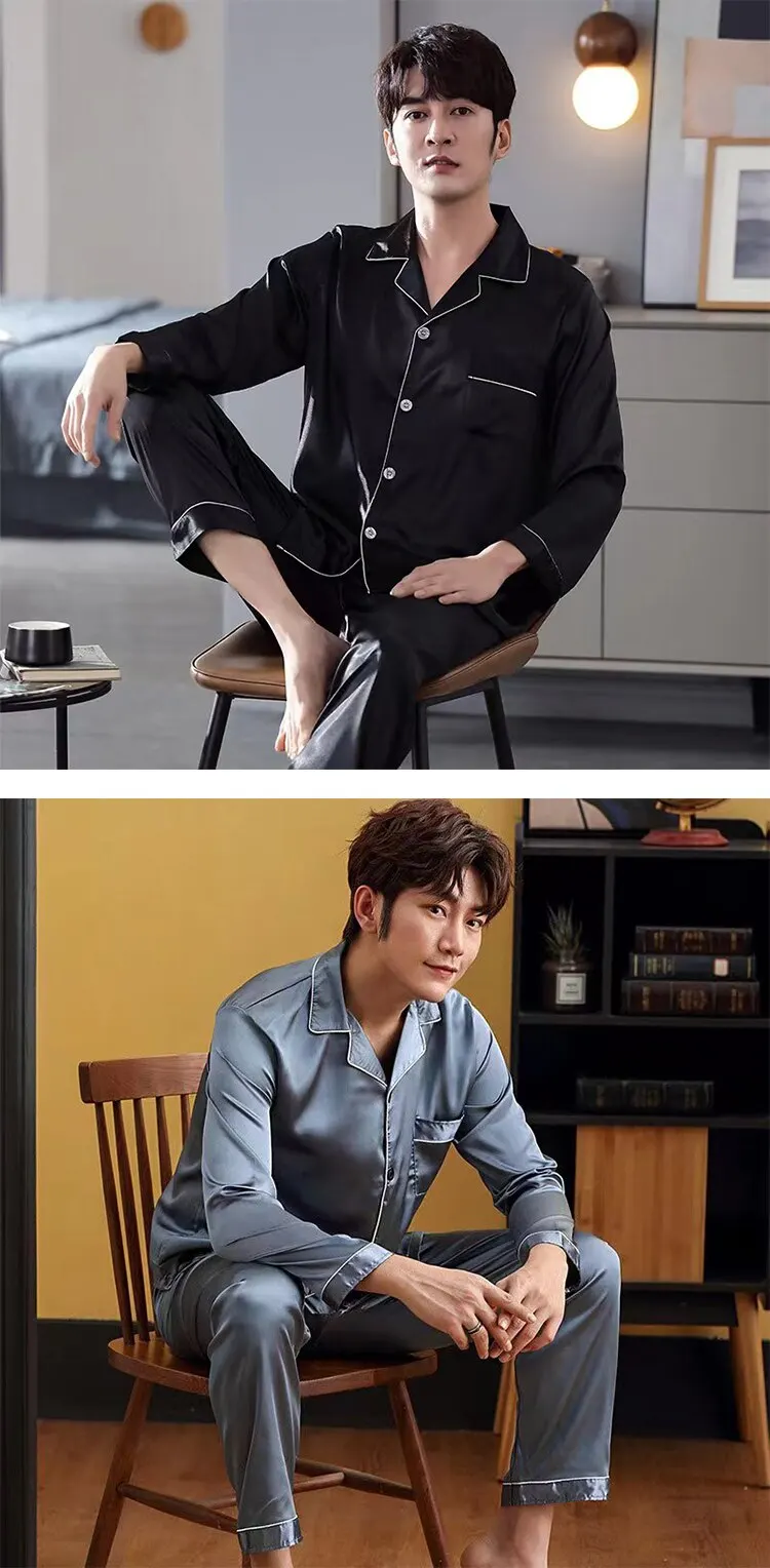 Men Ice Silk Pajamas Sleepwear Pajama Sets Nightclothes Black Blue L XXL 3XL 4XL Long Sleeves Long Pants Smooth Solid Color