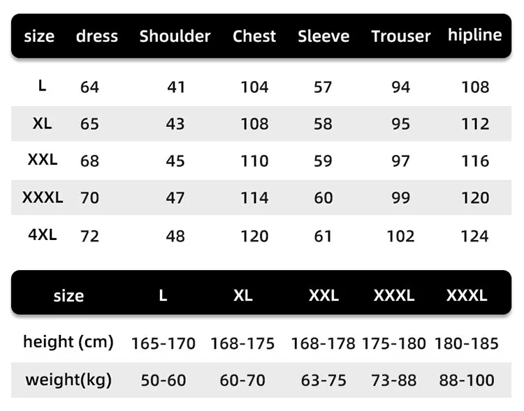 Weight: 60-70KG(XL), 63-75KG(2XL), 73-88KG(3XL), 88-100KG(4XL)