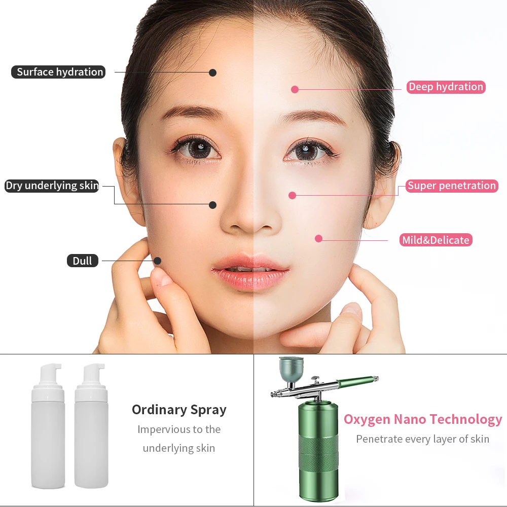 Handheld oxygen injection device: nano water replenishment + high pressure oxygen injection + facial cleansing + absorption promotion, multiple skin care, make your skin moist, smooth and full of vitality.