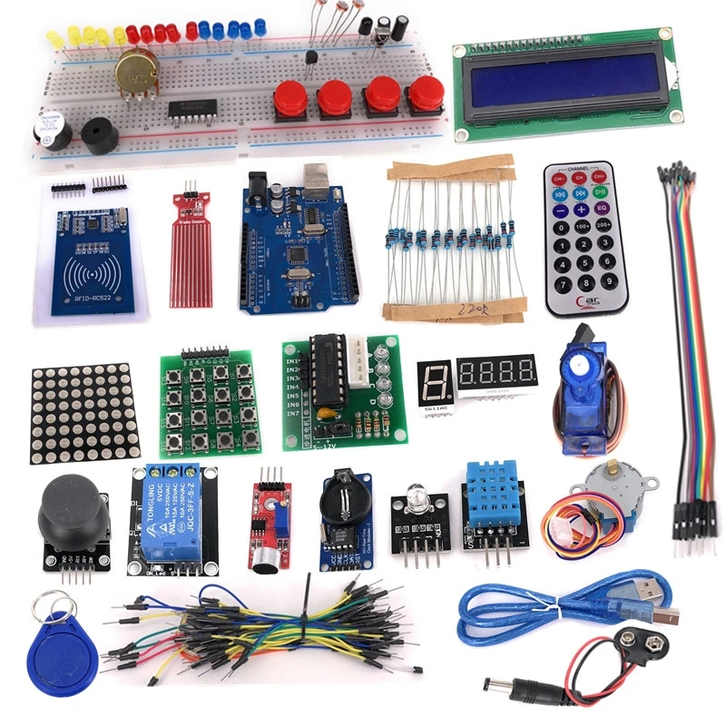 1 X UNO Board1 X USB Cable1 X Jump Cable1 X Breadboard5 X LED Light1 Pack Resistor1 X Female to male dupond line1 X Potentiometer1 X Buzzer1 X 74HC5951 X Infrared receiver1 X LM351 X Flame Sensor1 X Ball Switch1 X Photoresistor1 X Key button1 X Remote control1 X 4-digit display tube1 X 8*8 Dot matrix module1 X 1-digit display tube1 X Stepper motor driver board1 X Stepper motor1 X 9g Servo1 X IIC 1602 LCD1 X XY joystick module1 X Temperature module1 X Water test module1 X RFID Module1 X RFID keychain1 X RFID White card1 X Sound Module1 X Relay Module1 X Clock Module1 X 4*4 Key board1 X RGB 3 color module1 X 9V battery Snap