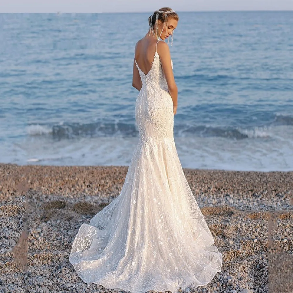 Ramanda Simple Sleeveless Beach Wedding Dress 2023 Spaghetti Straps V-Neck Bridal Gowns Lace Appliques Backless Robe De Mariée