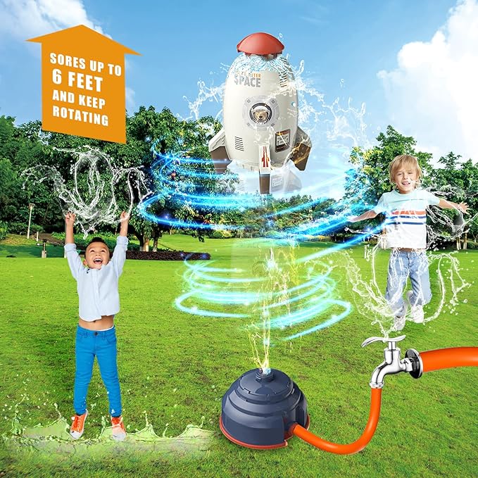 [Easy to Install & Much Fun] This rocket launcher outdoor sprinkler toy is very easy to install. You just need to insert the hose to water tap and the bottom of the water rocket respectively, and then turn on the water tap, the flying sprinkler will fly and spray water, the height depends on your water pressure.