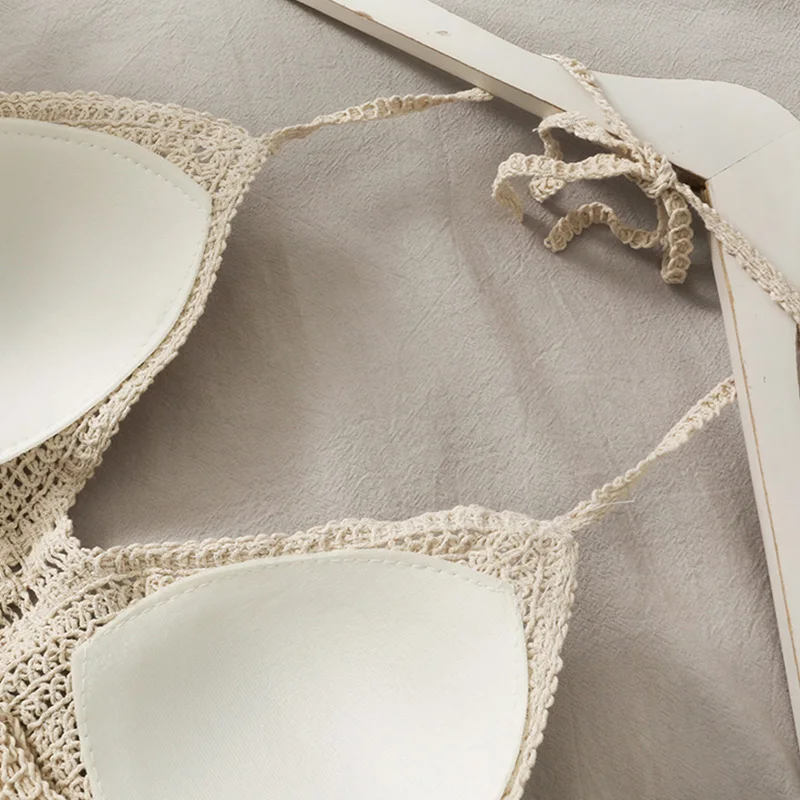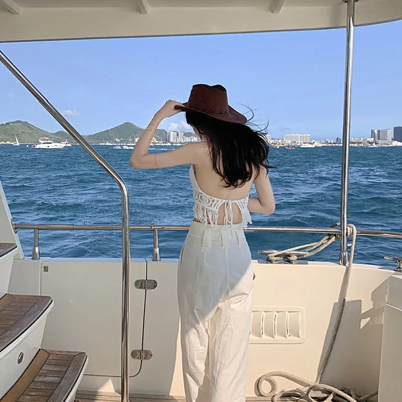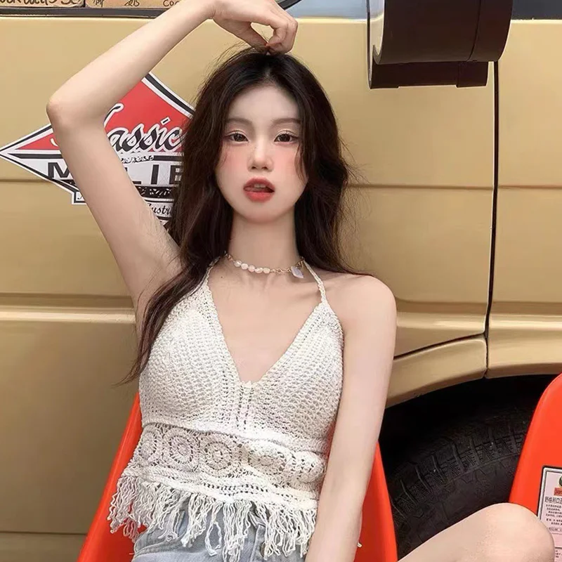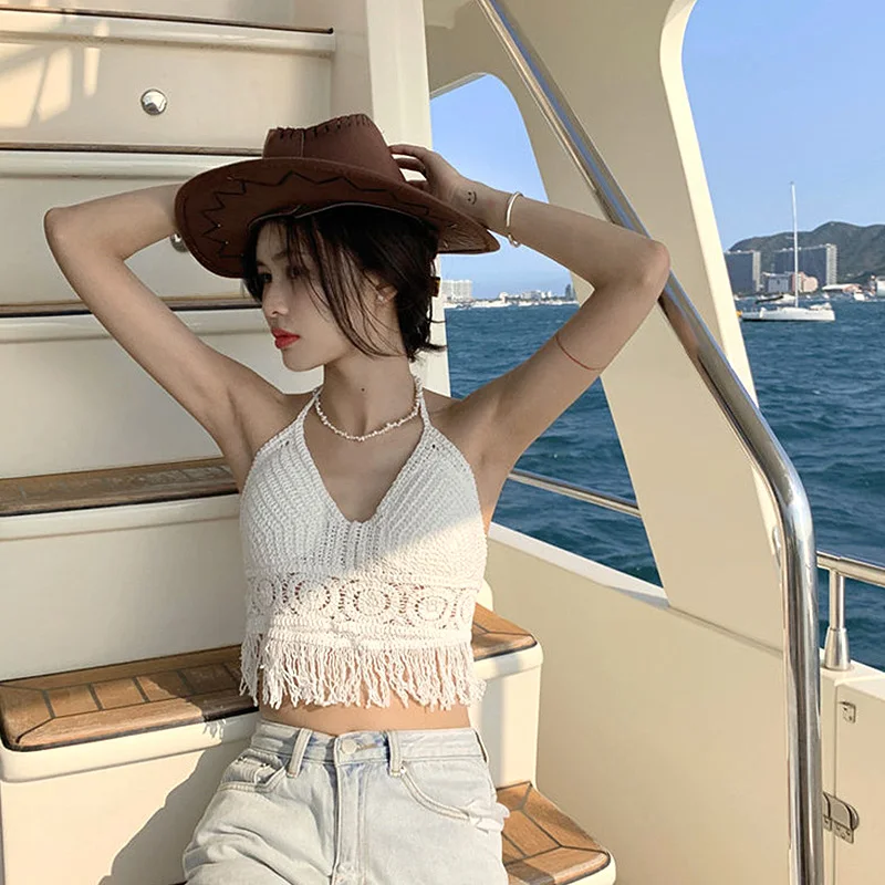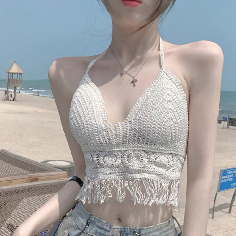 Sexy Boho Beach Holiday Camisole Halter Women Crochet Knit Swimsuit Bra Backless Vest Hollow Tassel Tank Top Women's Crop Tops