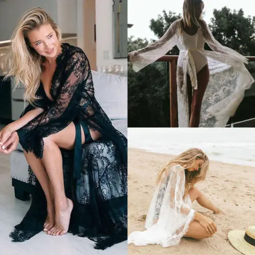 Summer Women Lace Crochet Bikini Lady Cover Up Kimono Cardigan Swimwear Kaftan Bathing Suit Long Sleeve Vacation Beach Dress