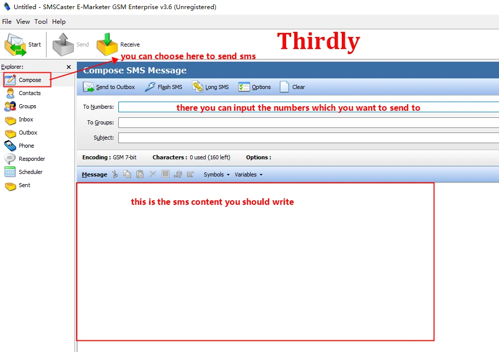 Compose for sending sms ,you can input receiver number in To Numbers if you just want to send few numbers, then input the content, when you finish, then press Send to Outbox, the sms will be sent to Outbox, press the Outbox ,then you can see the detail sms list, then press the Send.They will be sent out (you should firstly choose the ports which you want to send sms ).